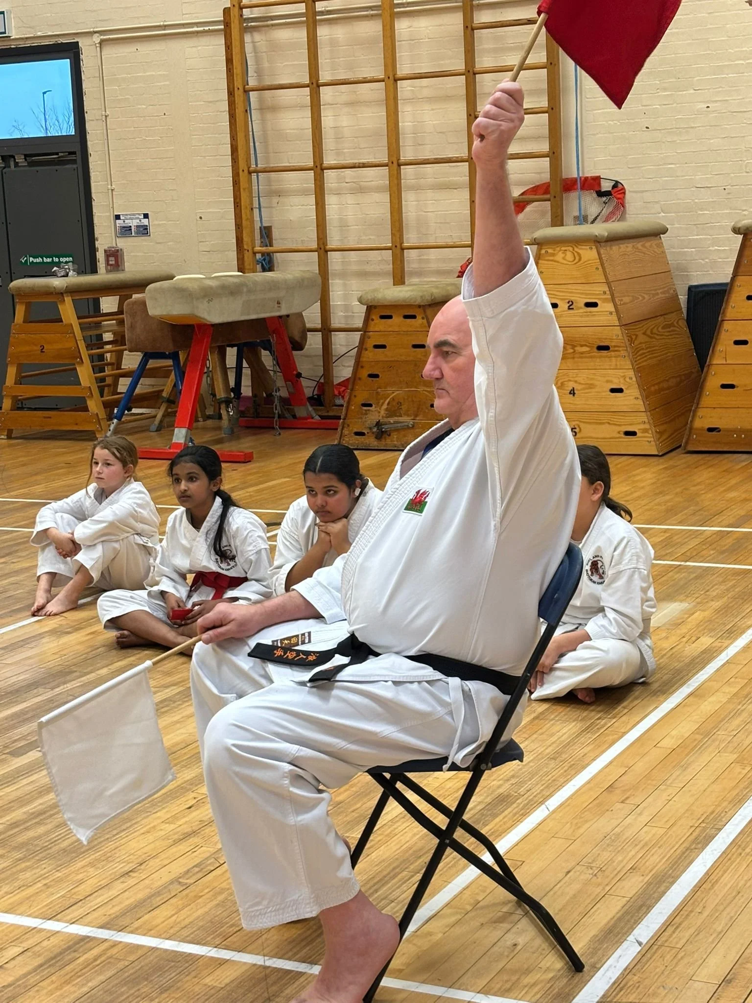 The Rhyl dojo was transformed into a competition arena, with a single central tatami. Senseis Richard (referee), Russell, Steve, Francis, Matthew (judges) and Tegwen (desk) officiated. All club members were given the opportunity to compete with a total of 4 separate categories: